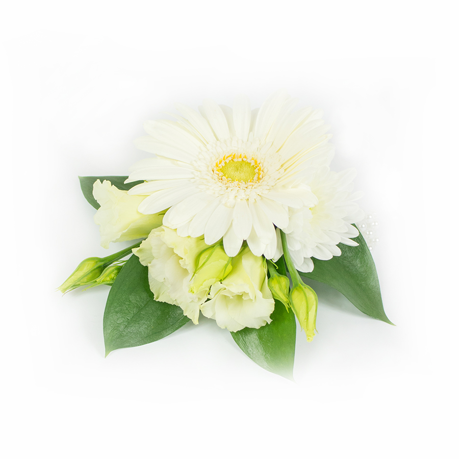Elevate your special occasion with our exquisite pearly white corsage. Perfect for proms, bridesmaids, and bridal dresses, this arrangement features a stunning combination of gerbera, alstroemeria, and chrysanthemums gracefully placed on a pearl bracelet, offering a sophisticated and elegant touch.