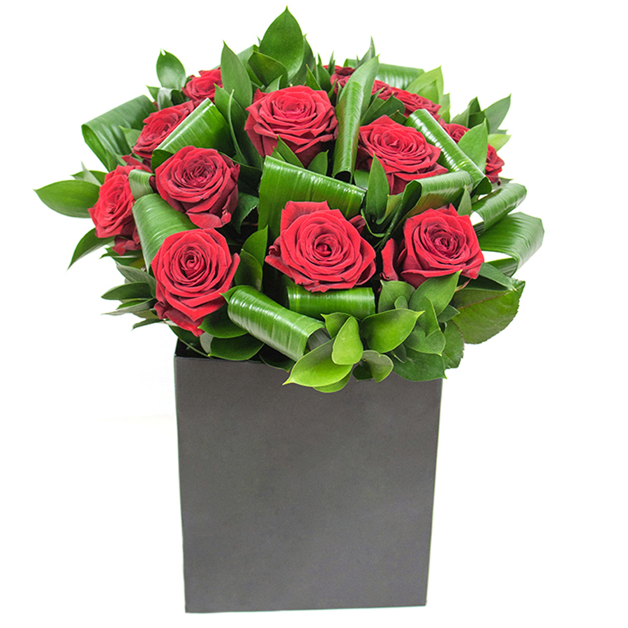 Enhance your home with our Elegant Red Rose Arrangement. This breathtaking bouquet features vibrant red roses, lush aspidistra leaves, and delicate ruscus, skillfully arranged to provide a visually captivating and sophisticated display.